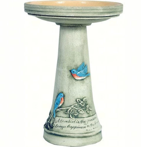 Bluebird Birdbath is handcrafted with in an aged stone finish and vibrant bluebirds. Quote reads A Bluebird in the garden brings happiness to the home