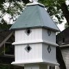 Fancy birdhouse features 8 compartments with perches. Components are manufactured on a CNC router to ensure absolute precision and quality in these distinctive copper roof bird houses.