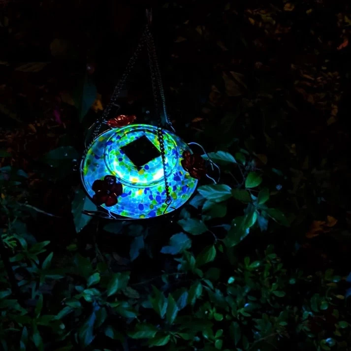 Illuminated hummingbird feeder features hand blown glass base and top, holds 18 oz. of nectar. Powder-coat metal perch for hummers’ comfort with sturdy chain for quick hanging.