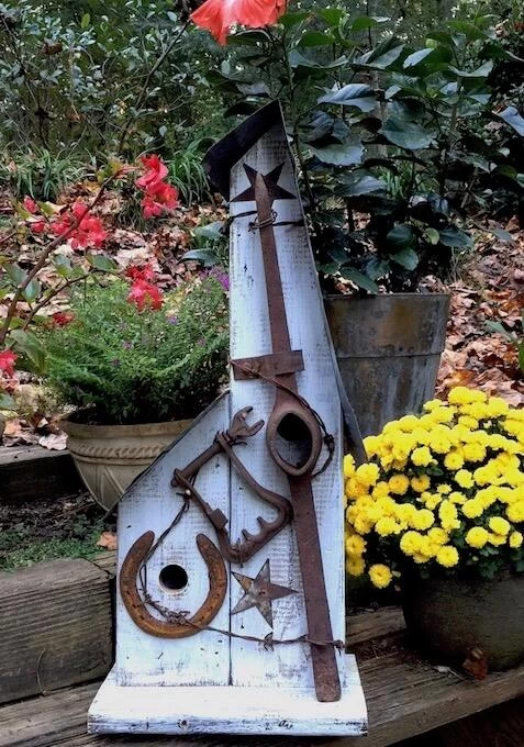 Unique birdhouses are hand made in the North Georgia mountains from repurposed materials and actual farm tools. They make perfect nest sites in spring and roosting spots during the off-season.